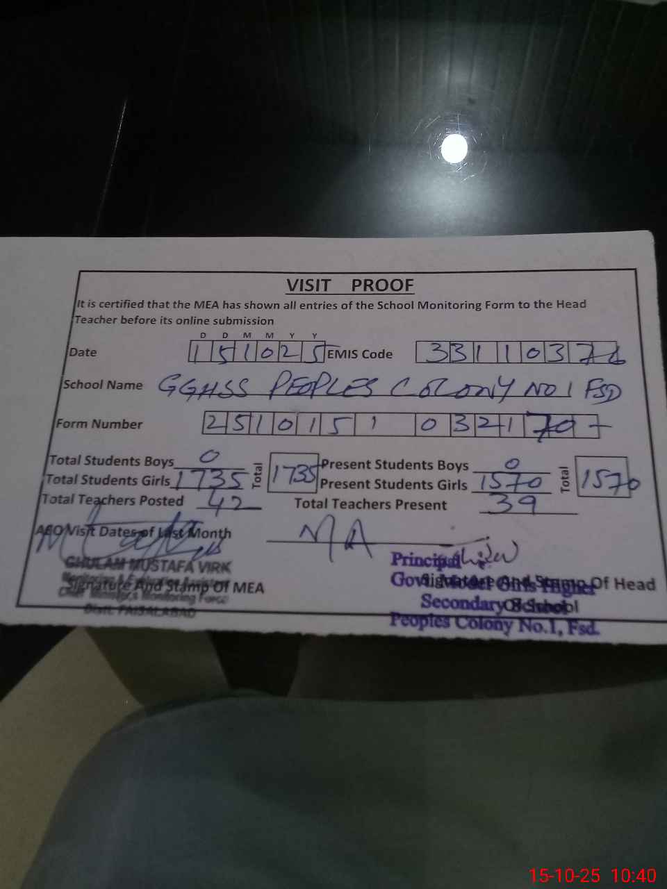 | EMIS Code: 33110376 | Name of School: GGHSS PEOPLES COLONY NO. 1 FSD | |||