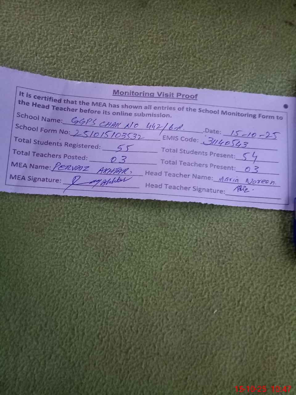 | Monitoring Date: 15-10-2025 | Start Time: 15-10-2025 10:35 AM | End Time: 15-10-2025 10:47 AM | Name of MEA: Pe**** Ak**** BN**** 12 | |