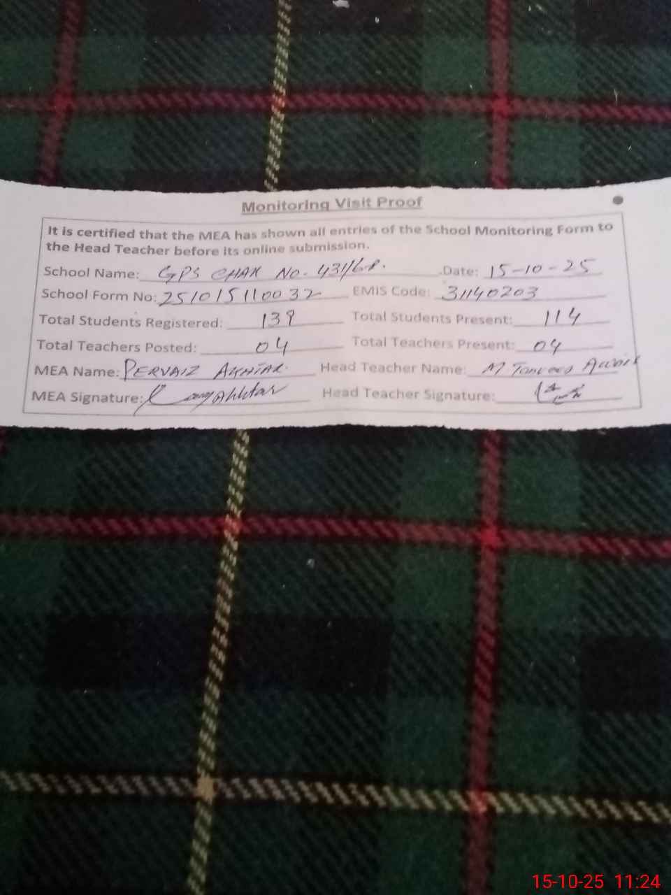 | Attendance Register | Head Teacher | MEA with School | Visit Proof |