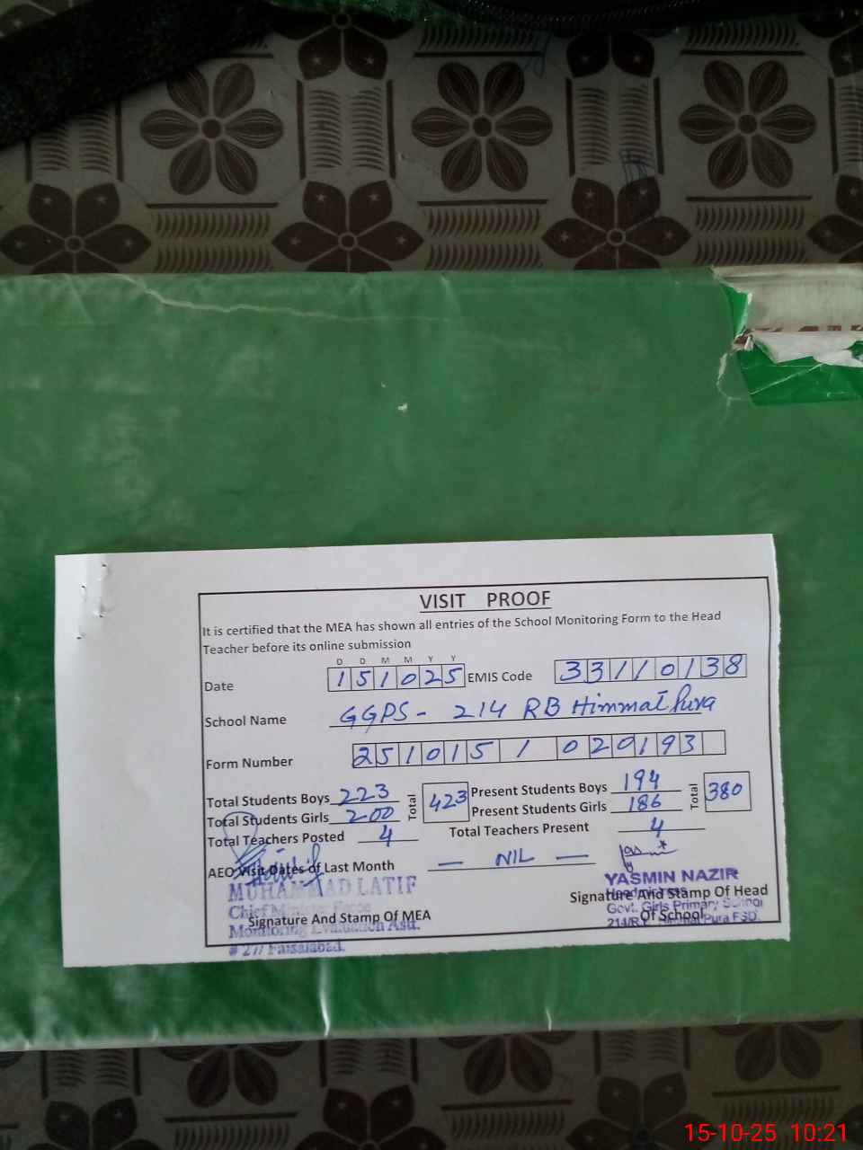 | EMIS Code: 33110138 | Name of School: GGPS CHAK NO 214 RB HIMMAT PURA | |||