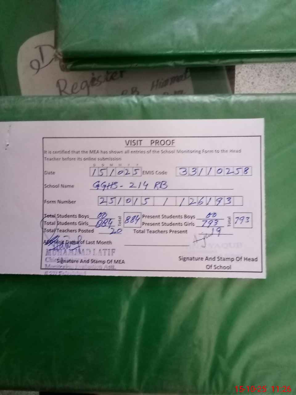 | Attendance Register | Head Teacher | MEA with School | Visit Proof |