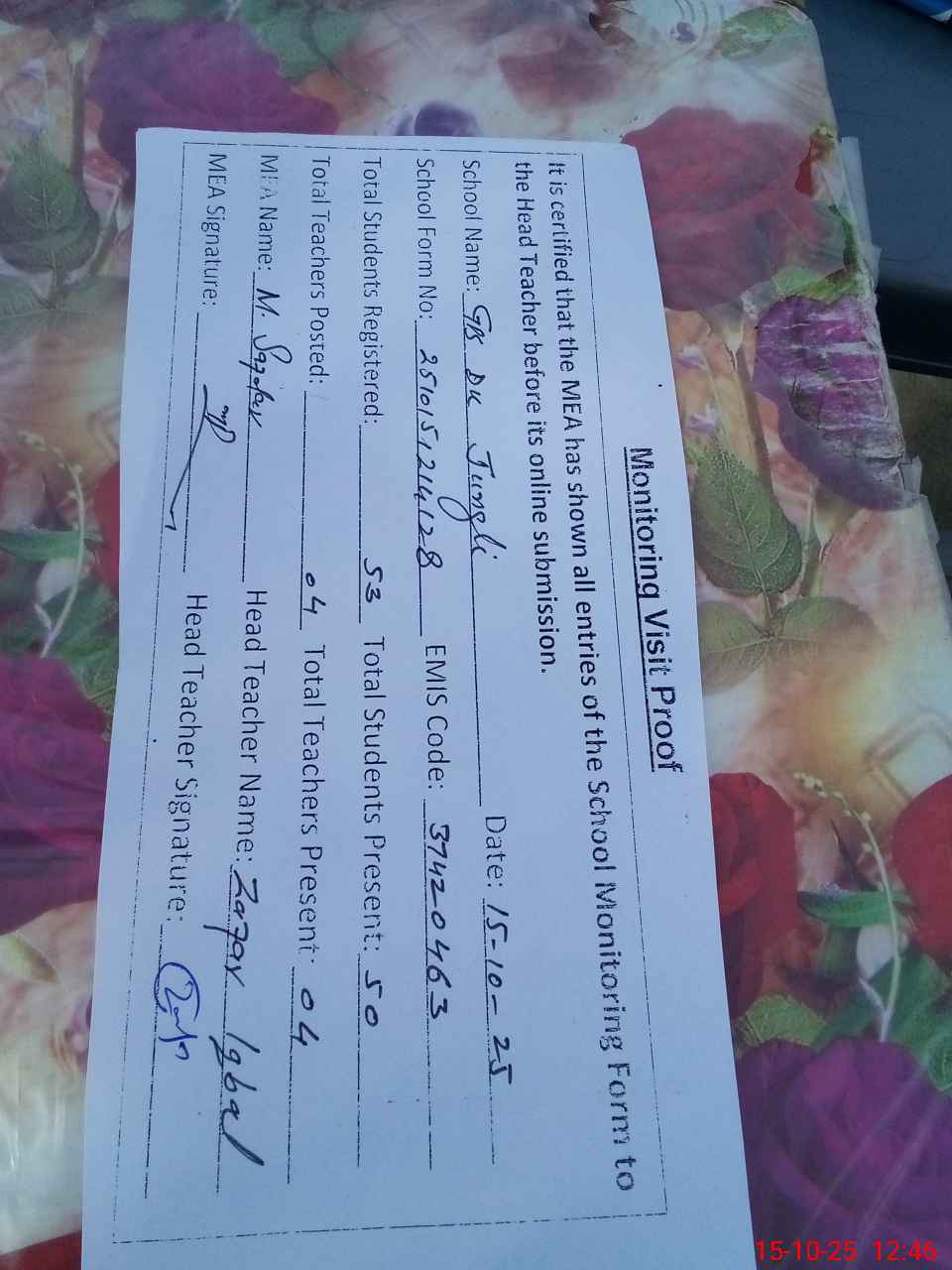 | Attendance Register | Head Teacher | MEA with School | Visit Proof |