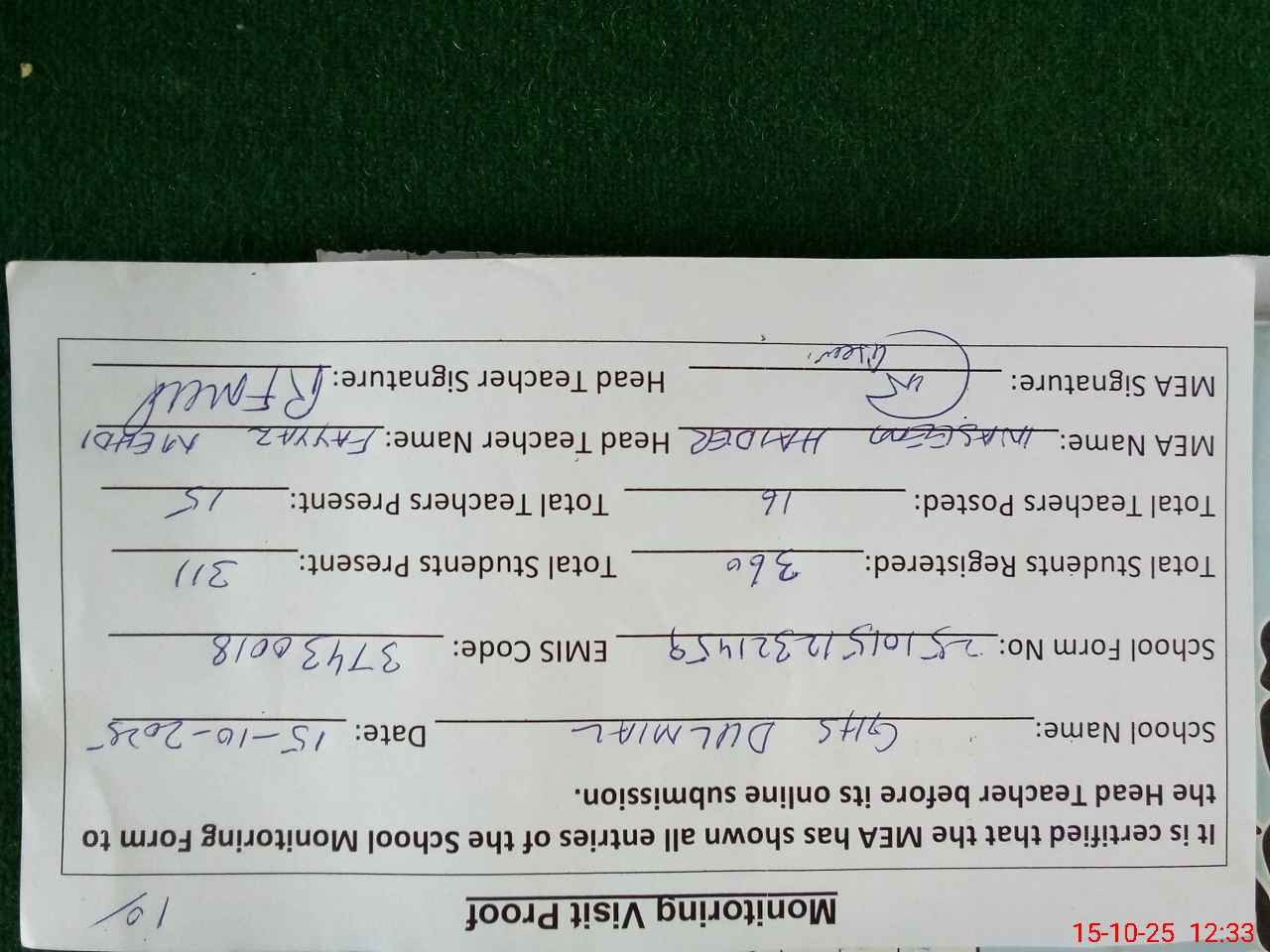 | Attendance Register | Head Teacher | MEA with School | Visit Proof |