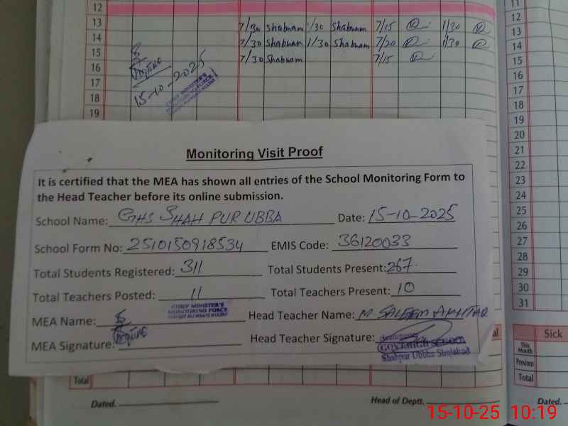 | EMIS Code: 36120033 | Name of School: GHS SHAH PUR UBBHA SHUJABAD | |||