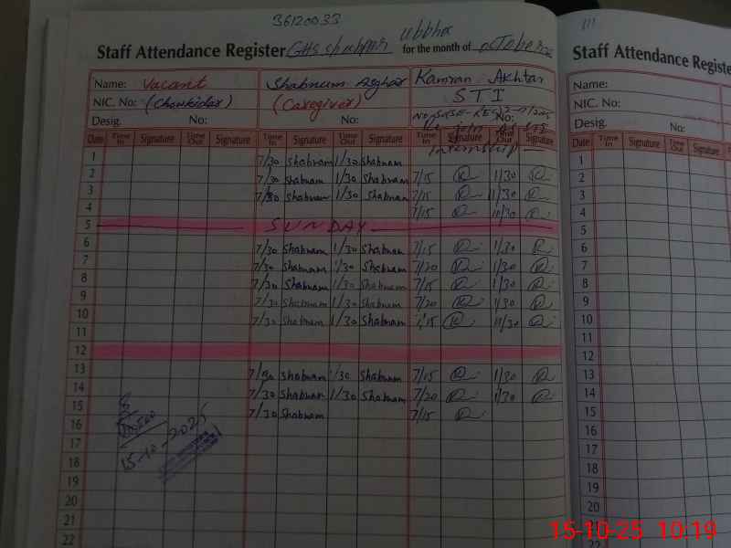 | CNIC | Full Name | Designation | R/C | Absence During Last Calender Month |