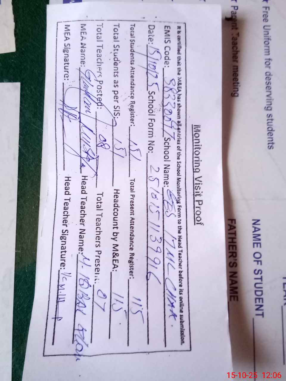 | Attendance Register | Head Teacher | MEA with School | Visit Proof |