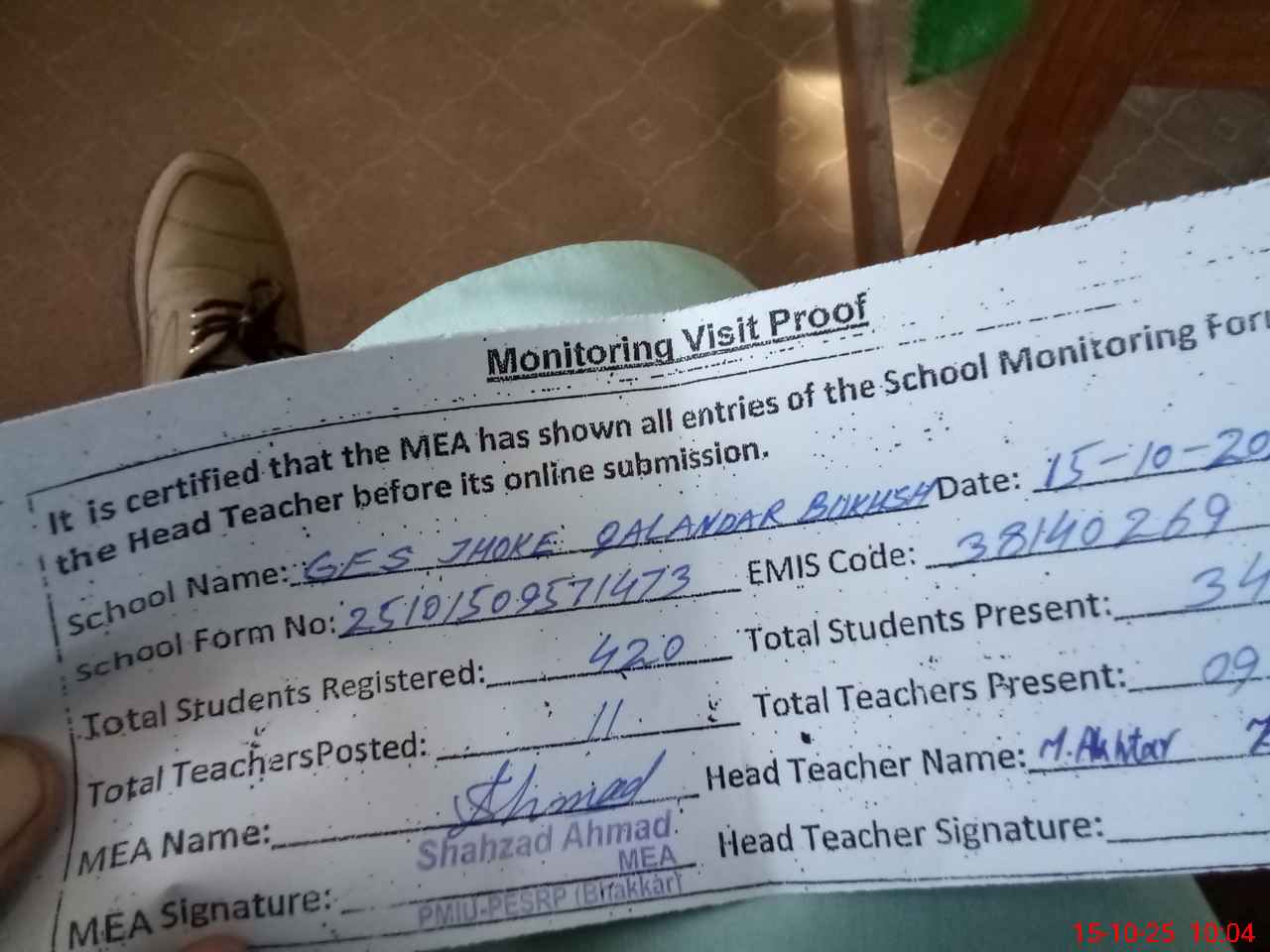 | Attendance Register | Head Teacher | MEA with School | Visit Proof |