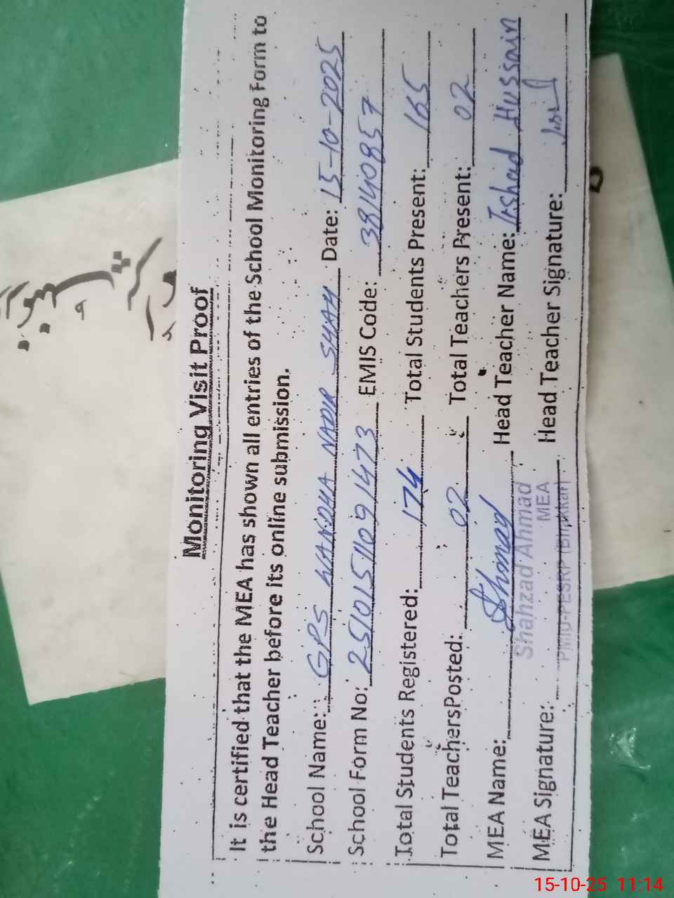 | Attendance Register | Head Teacher | MEA with School | Visit Proof |