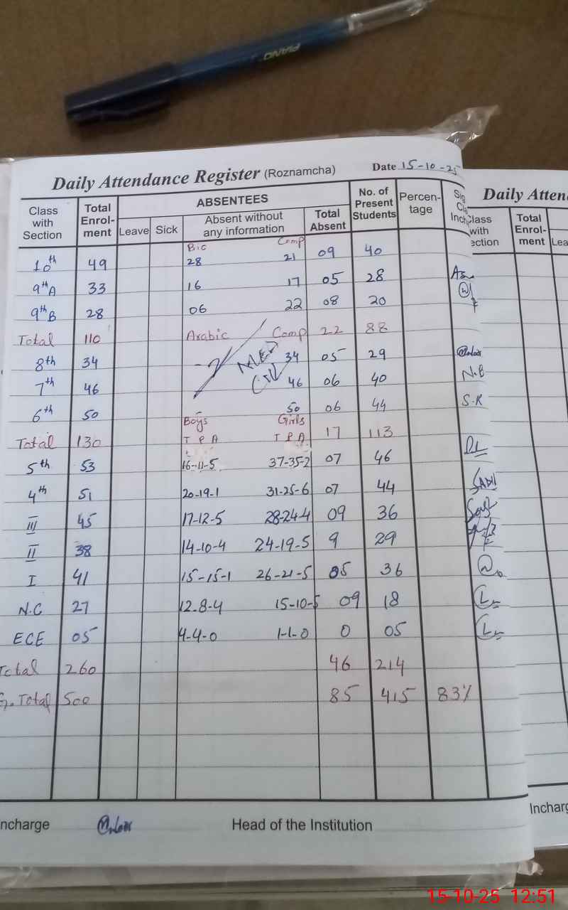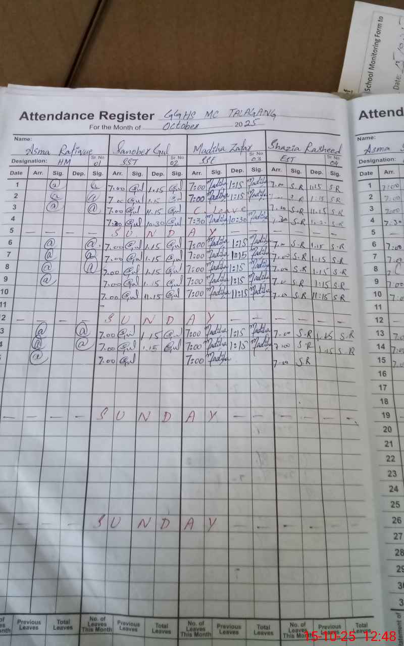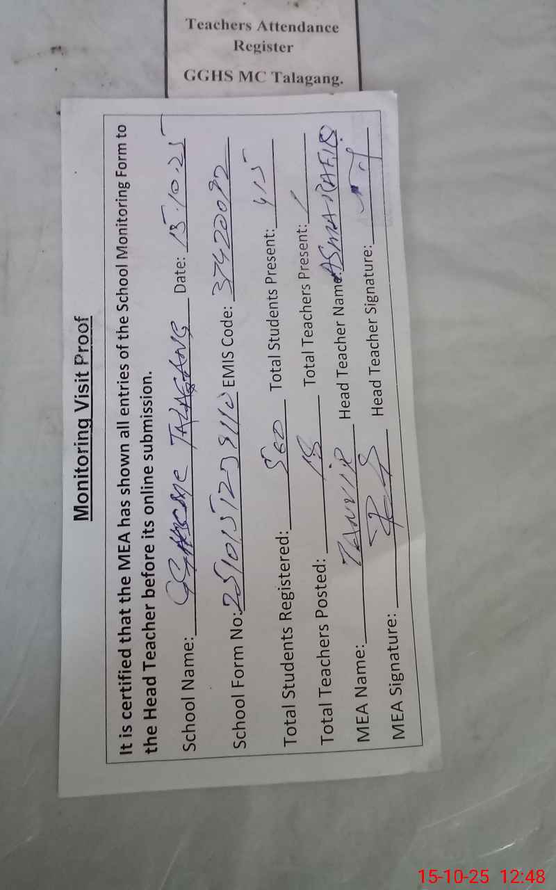 | Attendance Register | Head Teacher | MEA with School | Visit Proof |