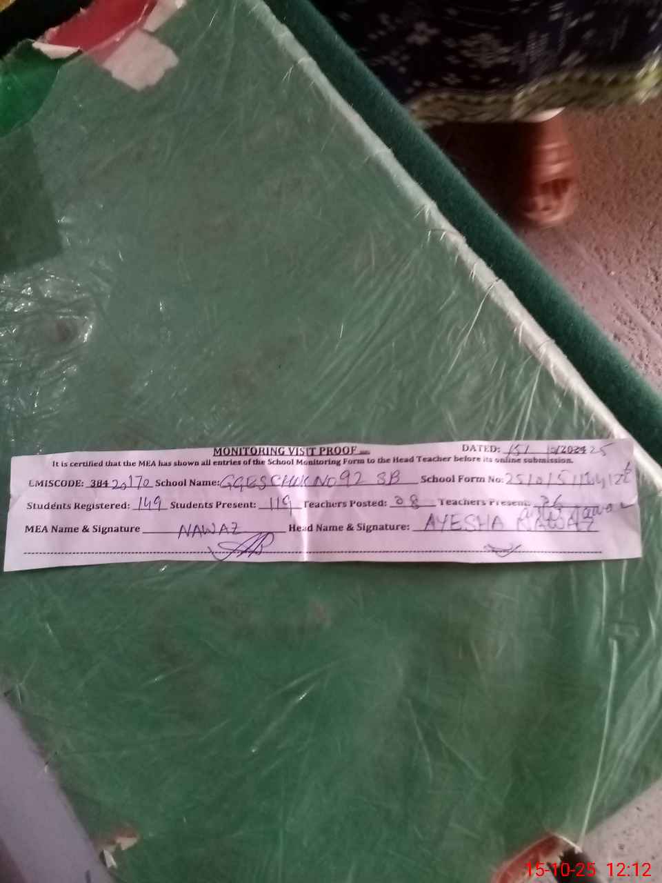 | EMIS Code: 38420170 | Name of School: GGES CHAK NO.92 SB | |||