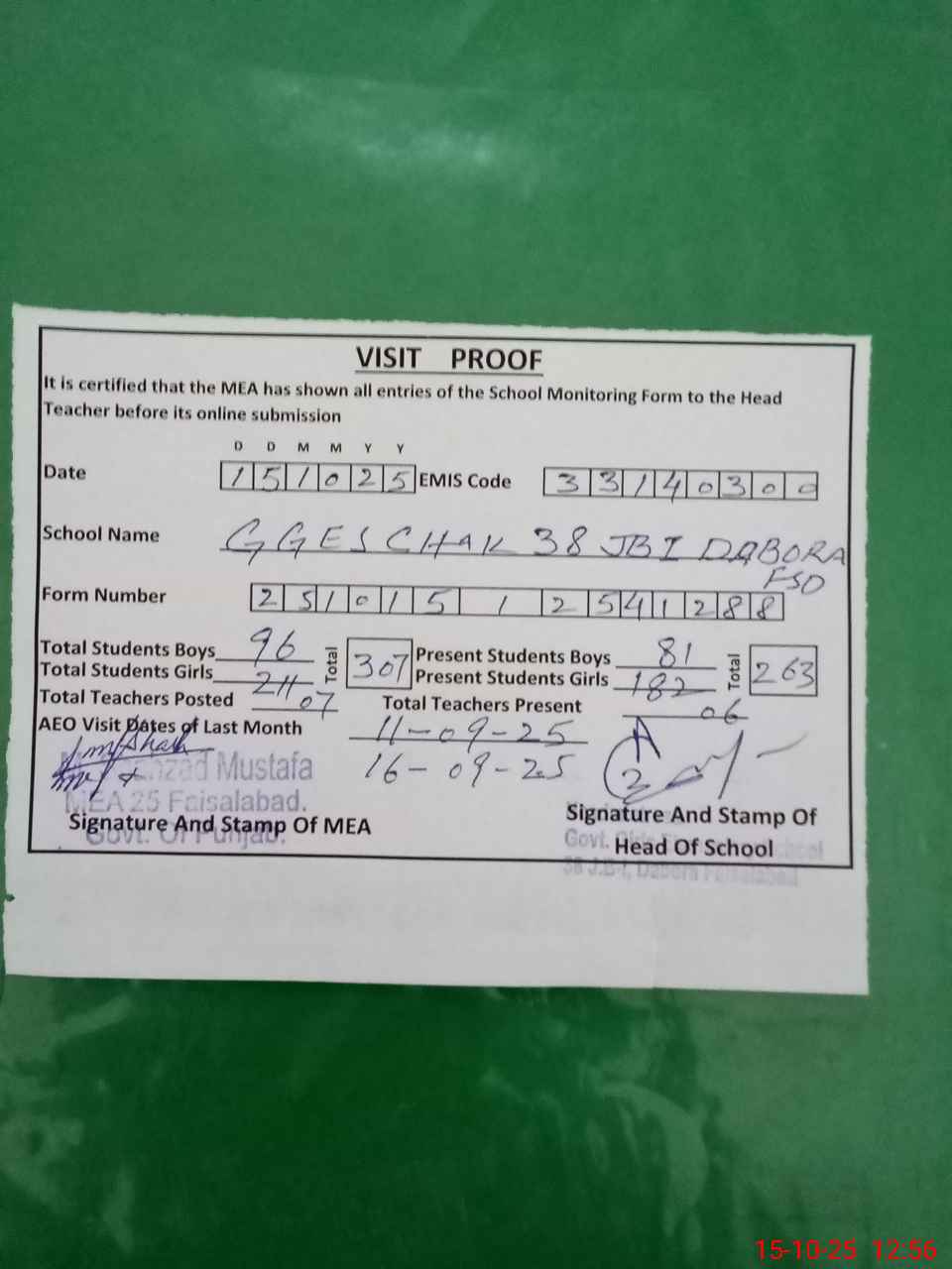 | Certified that this School was Inspected by the Undersigned MEA/DMO Today and the Information Stated Above is as Per Record. | |||||