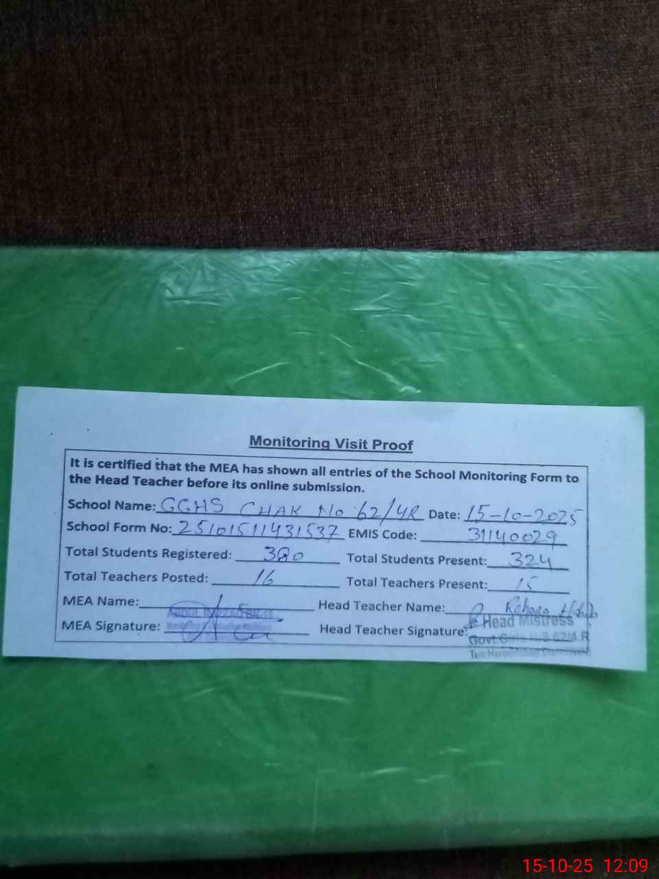 | EMIS Code: 31140029 | Name of School: GGHS CHAK NO.62/4-R | |||
