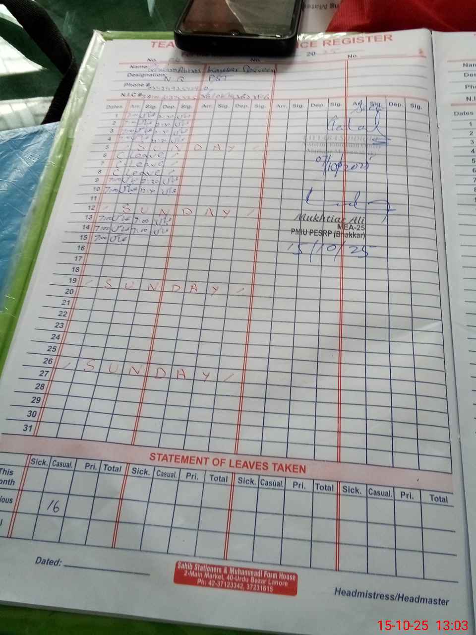 | Name: Um**** ELa**** Designation: (School Headmaster's/Headmistress's) SST Phone/Cell Number: 03**** |