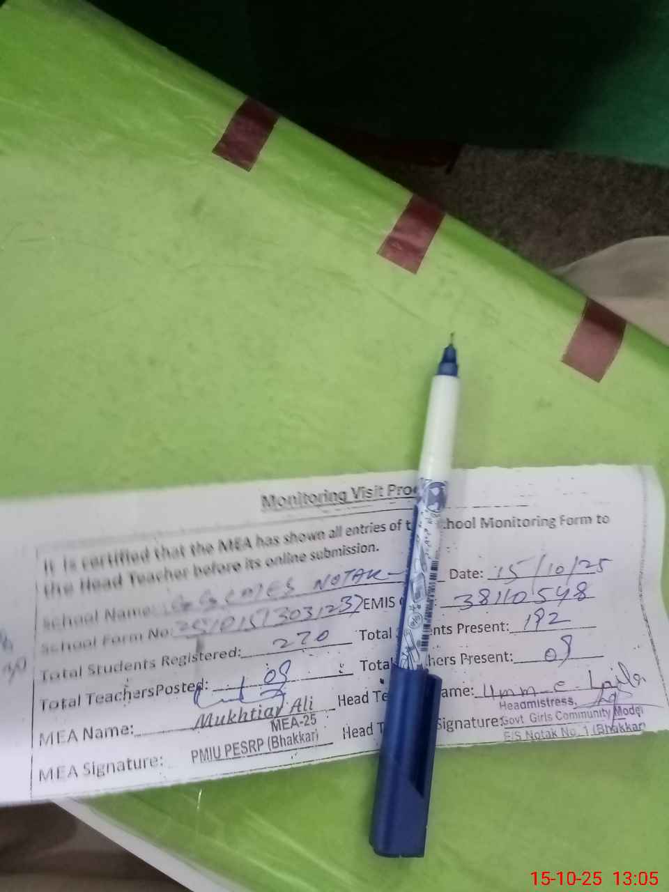 | Certified that this School was Inspected by the Undersigned MEA/DMO Today and the Information Stated Above is as Per Record. | |||||
