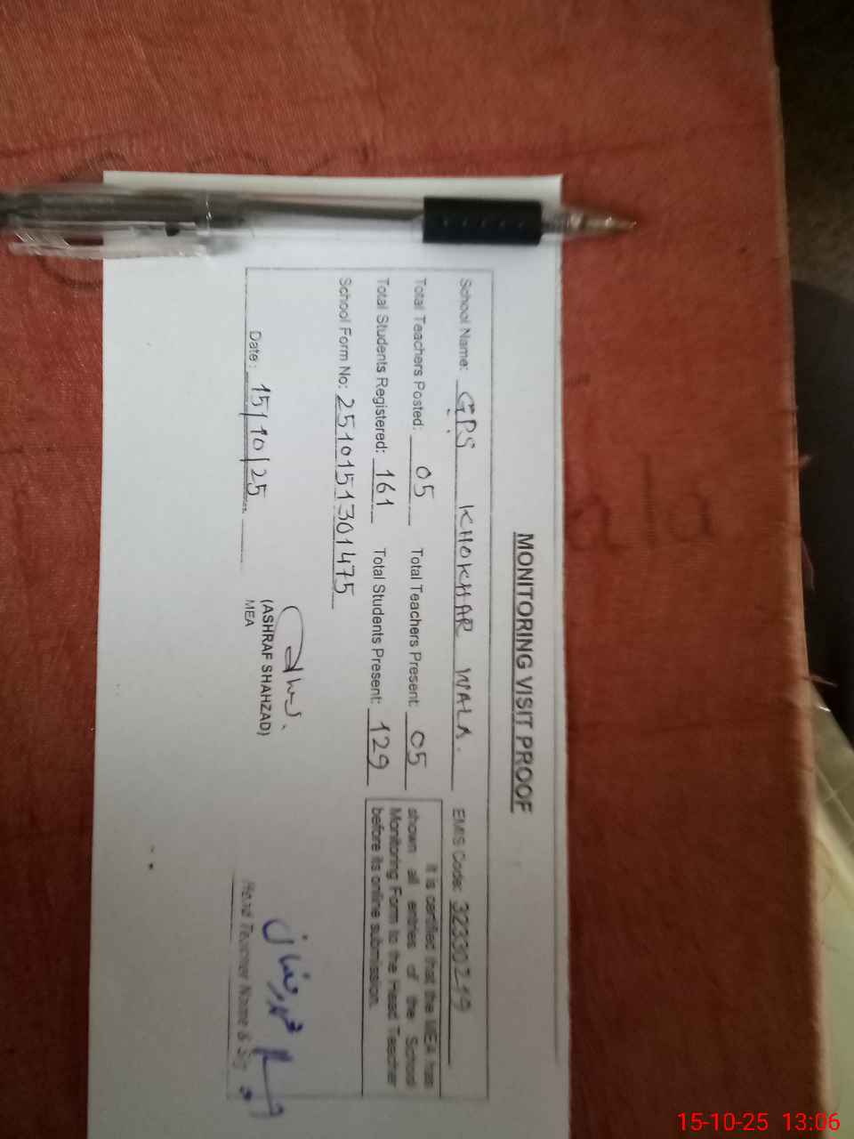 | Attendance Register | Head Teacher | MEA with School | Visit Proof |