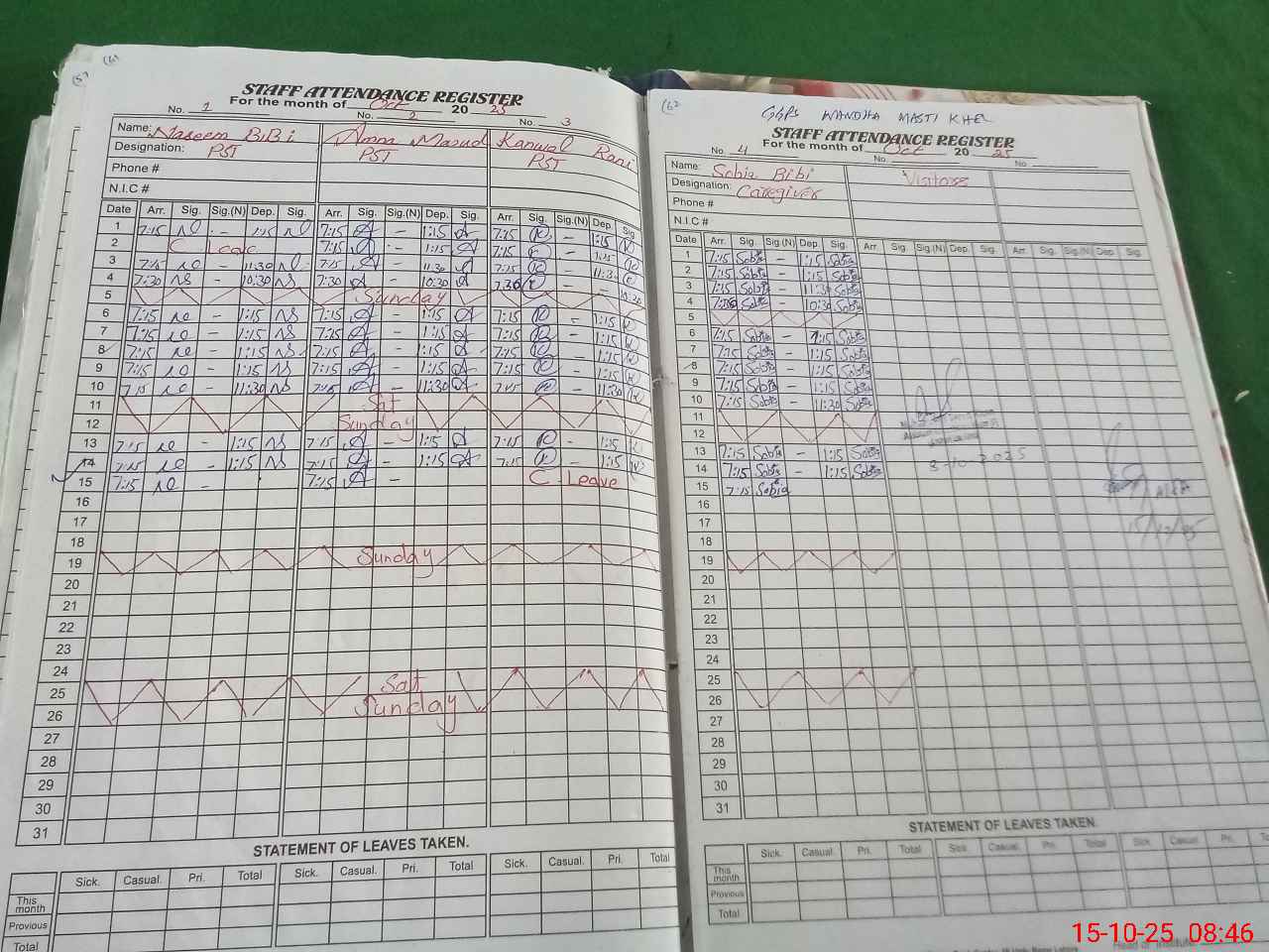 | CNIC | Full Name | Designation | R/C | Absence During Last Calender Month |