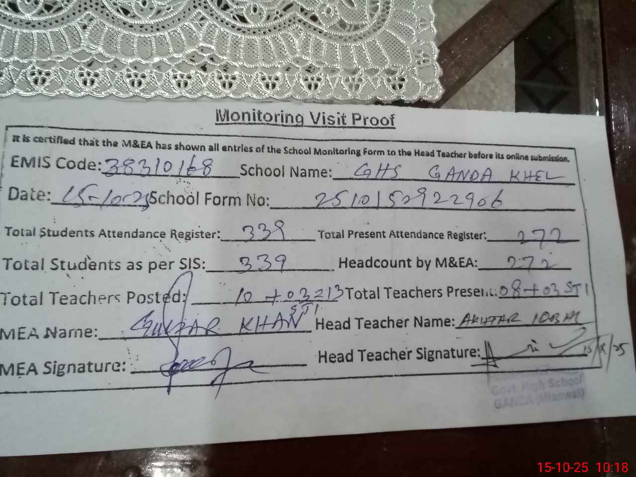 | EMIS Code: 38310168 | Name of School: GHS GANDA KHEL | |||