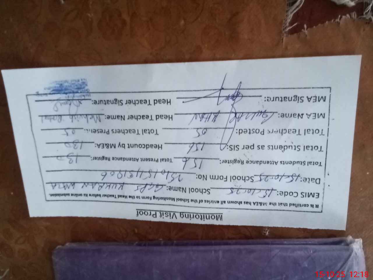 | Attendance Register | Head Teacher | MEA with School | Visit Proof |