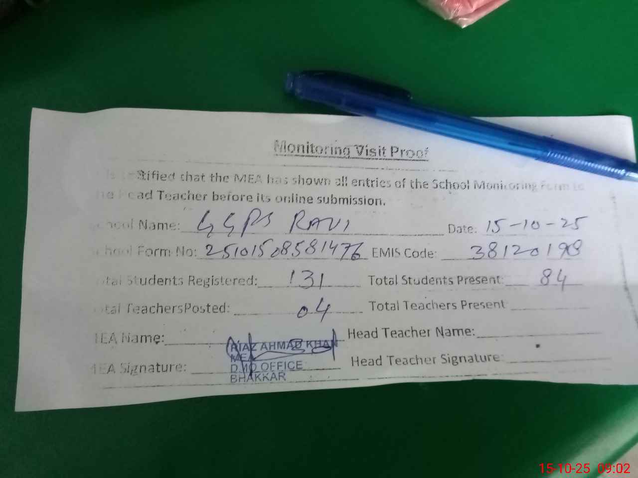 | Attendance Register | Head Teacher | MEA with School | Visit Proof |