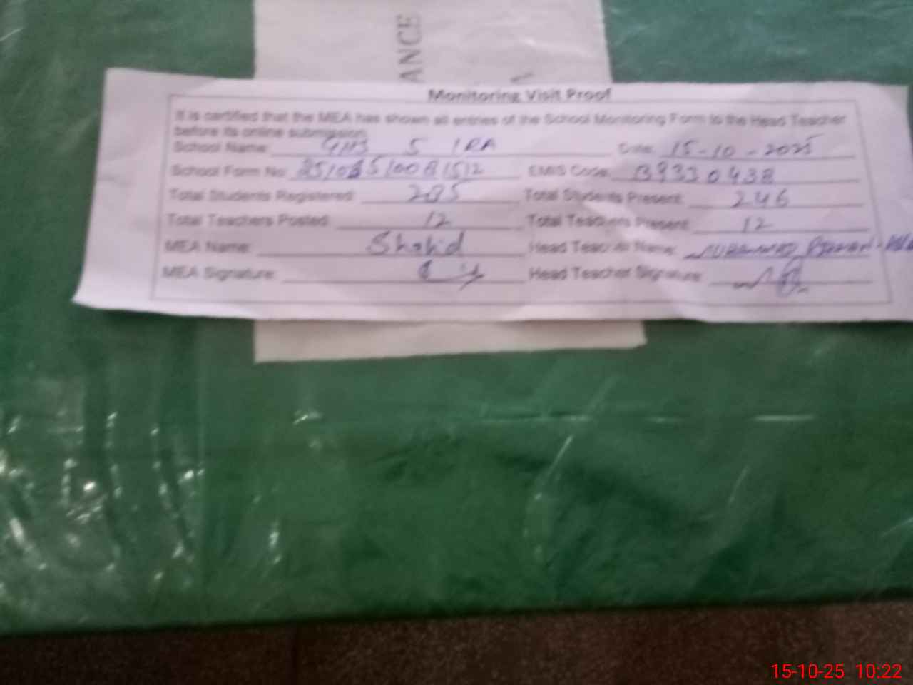 | Certified that this School was Inspected by the Undersigned MEA/DMO Today and the Information Stated Above is as Per Record. | |||||