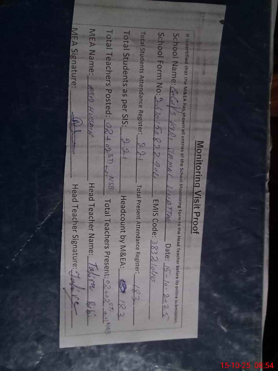 | Attendance Register | Head Teacher | MEA with School | Visit Proof |