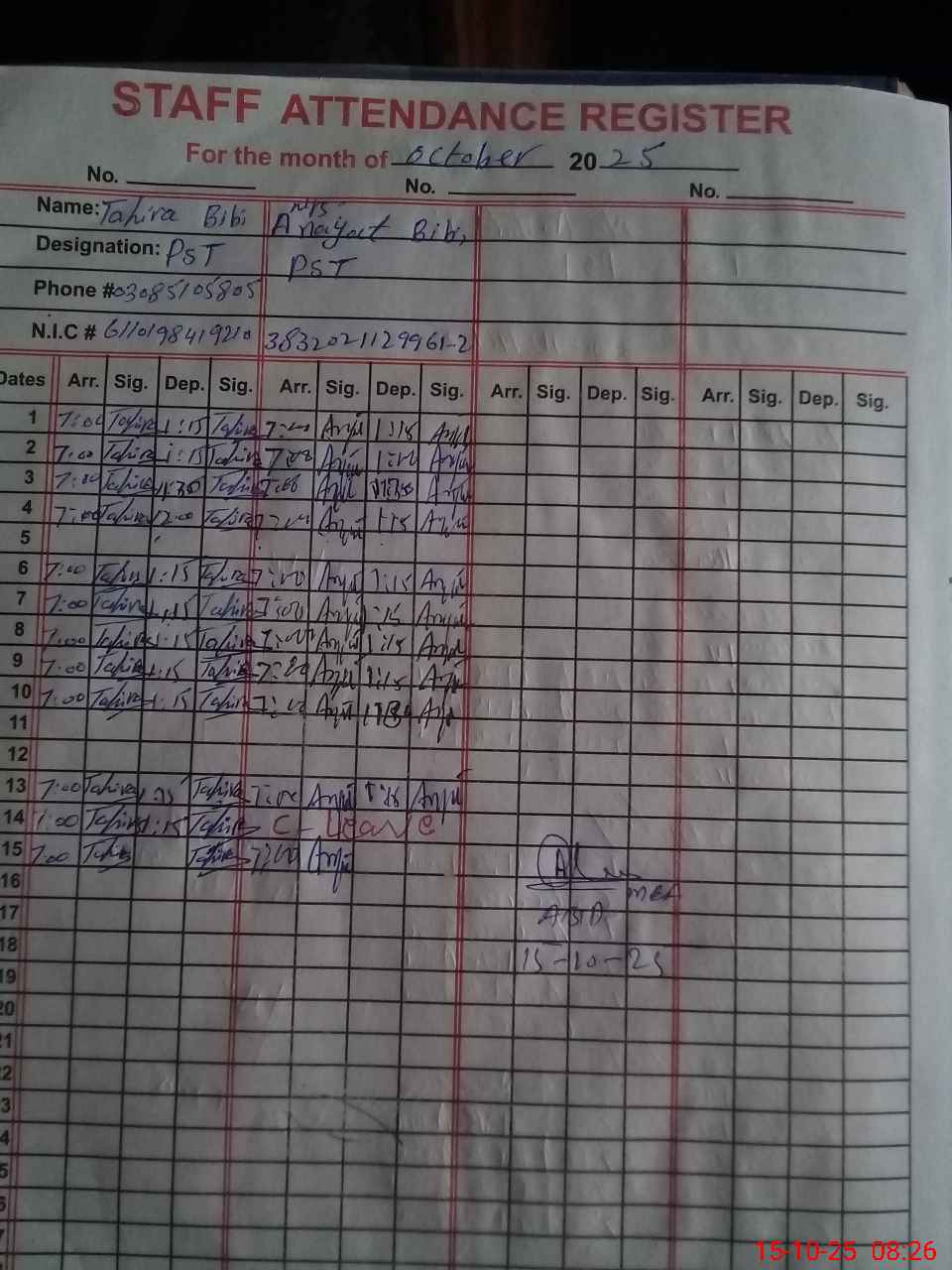| Name: Ta**** bi**** Designation: (School Headmaster's/Headmistress's) PST Phone/Cell Number: 03**** |