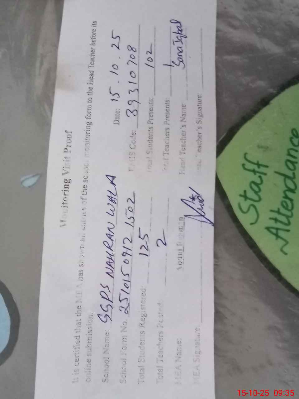 | Attendance Register | Head Teacher | MEA with School | Visit Proof |