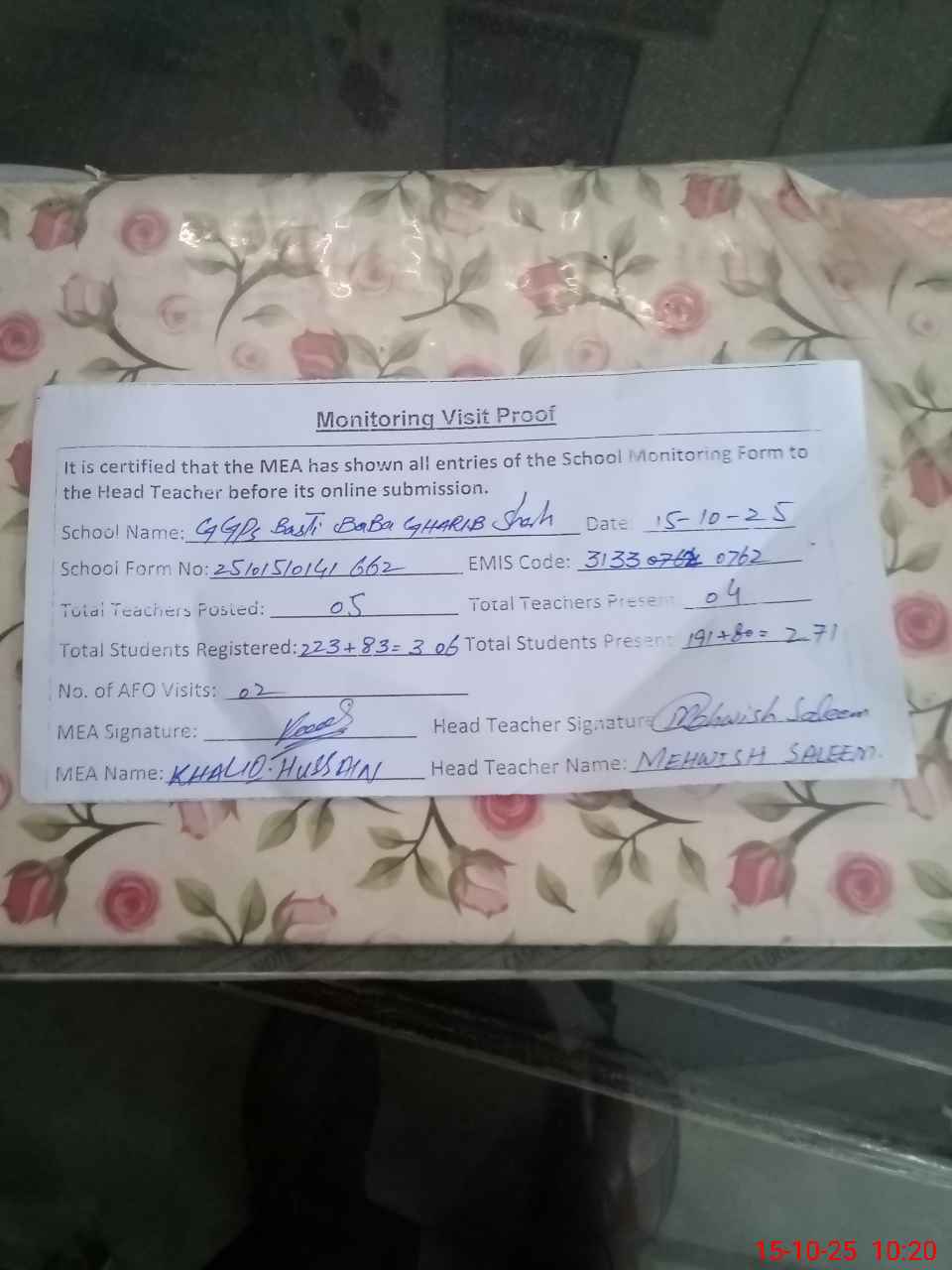 | EMIS Code: 31330762 | Name of School: GGPS BASTI BABA GHARIB SHAH | |||