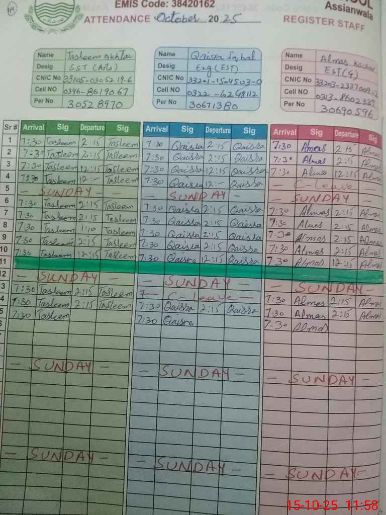 | CNIC | Full Name | Designation | R/C | Absence During Last Calender Month |