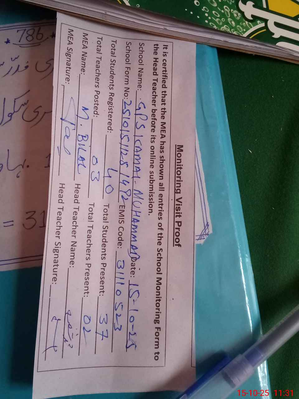 | Attendance Register | Head Teacher | MEA with School | Visit Proof |