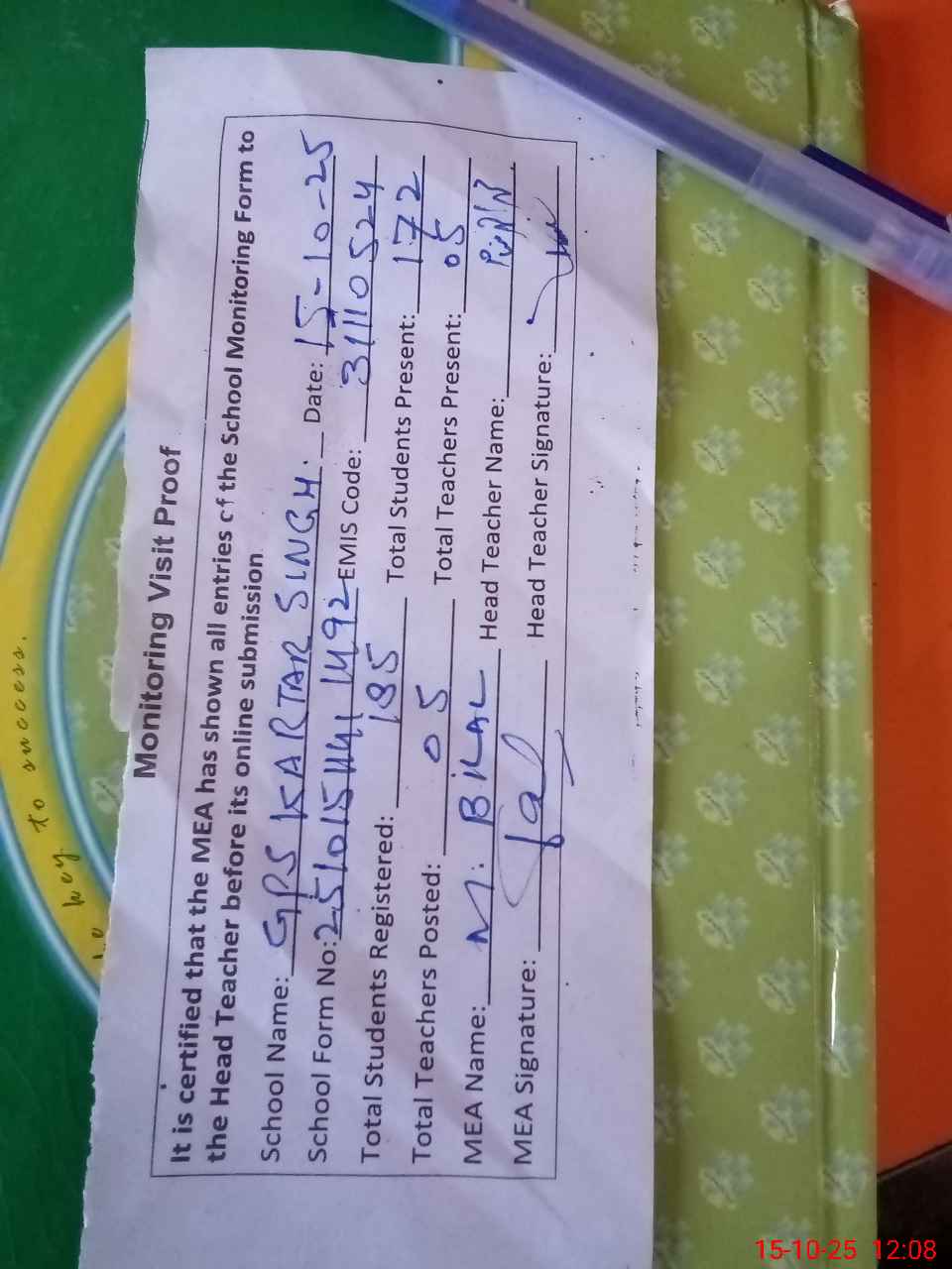 | Attendance Register | Head Teacher | MEA with School | Visit Proof |