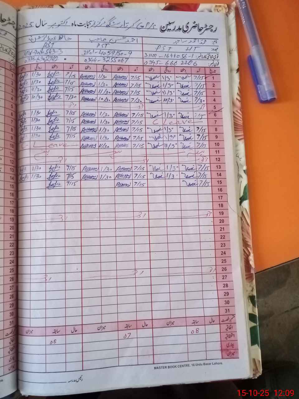 | CNIC | Full Name | Designation | R/C | Absence During Last Calender Month |