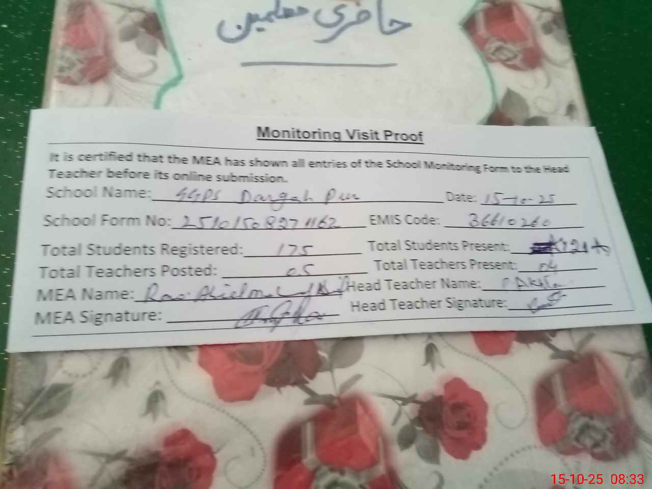 | Attendance Register | Head Teacher | MEA with School | Visit Proof |
