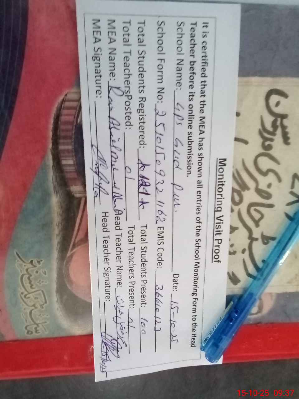 | Attendance Register | Head Teacher | MEA with School | Visit Proof |