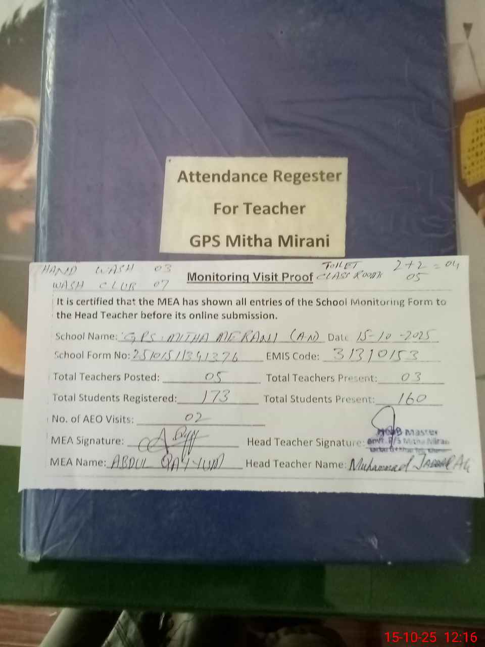 | EMIS Code: 31310153 | Name of School: GPS MITHA MERANI (After Noon) | |||