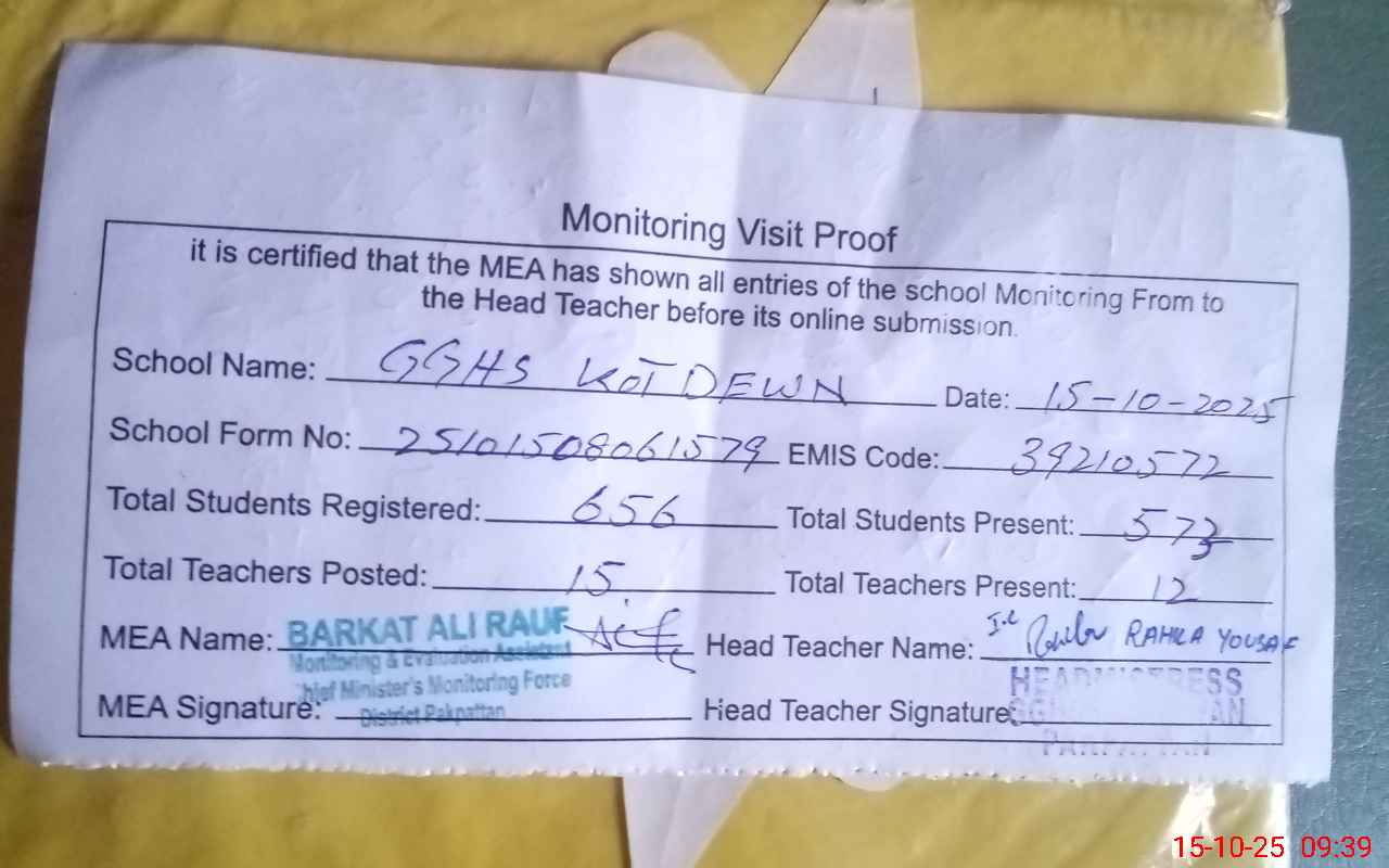 | EMIS Code: 39210572 | Name of School: GGHS KOT DEWAN | |||