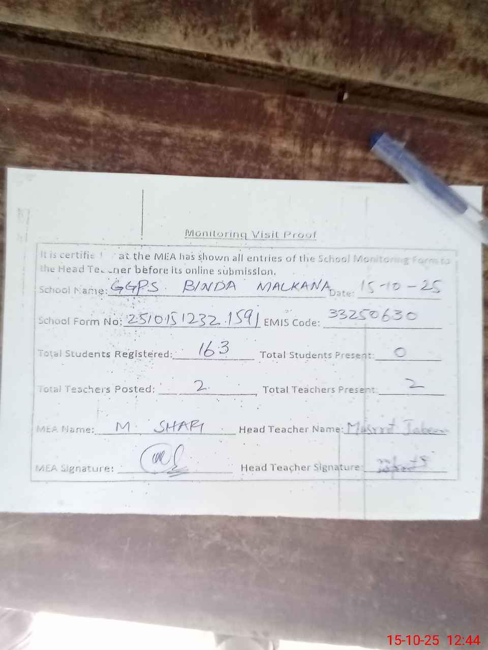 | Attendance Register | Head Teacher | MEA with School | Visit Proof |