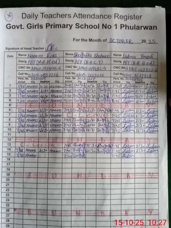 | CNIC | Full Name | Designation | R/C | Absence During Last Calender Month |