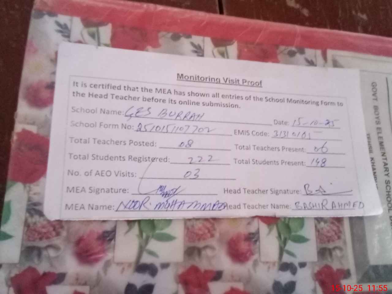 | Attendance Register | Head Teacher | MEA with School | Visit Proof |