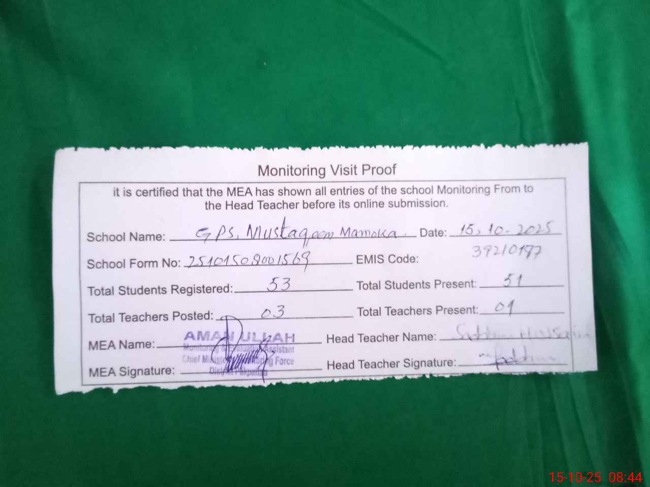 | Monitoring Date: 15-10-2025 | Start Time: 15-10-2025 08:00 AM | End Time: 15-10-2025 08:52 AM | Name of MEA: AM**** UL**** | |