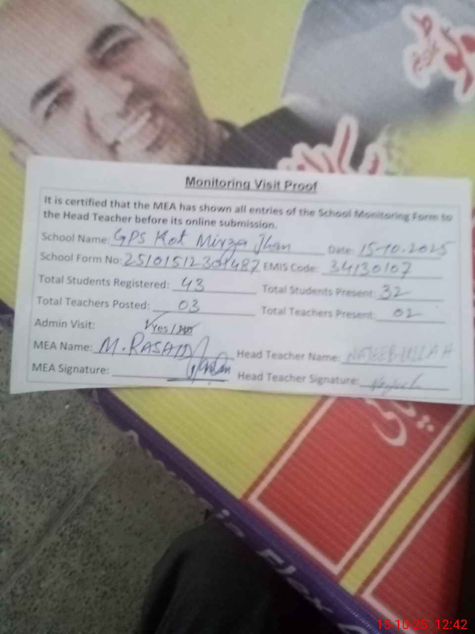 | Attendance Register | Head Teacher | MEA with School | Visit Proof |