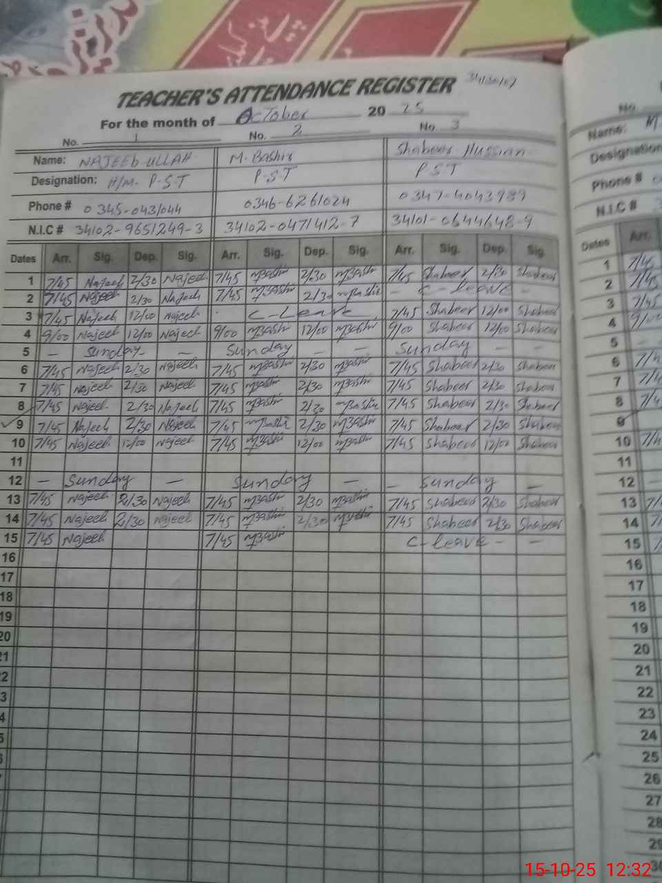 | CNIC | Full Name | Designation | R/C | Absence during last cal. month |