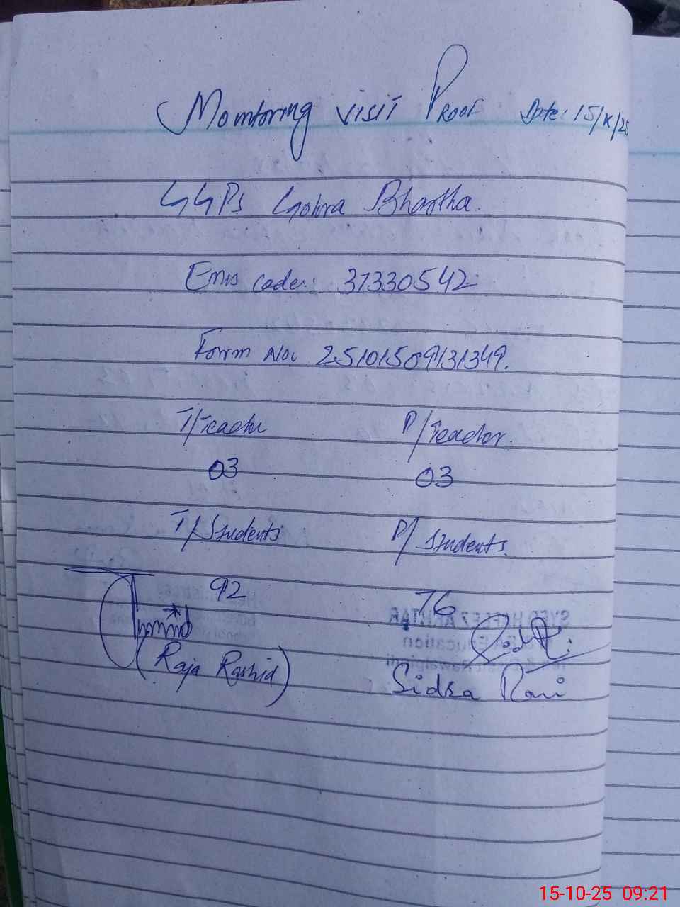 | Monitoring Date: 15-10-2025 | Start Time: 15-10-2025 08:54 AM | End Time: 15-10-2025 09:23 AM | Name of MEA: Ra**** Ra**** Al**** | |