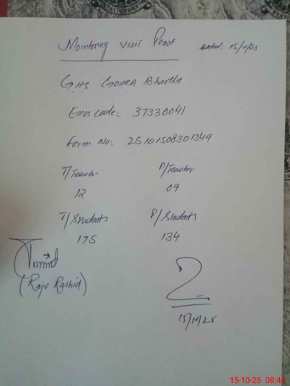 | Monitoring Date: 15-10-2025 | Start Time: 15-10-2025 08:05 AM | End Time: 15-10-2025 08:46 AM | Name of MEA: Ra**** Ra**** Al**** | |