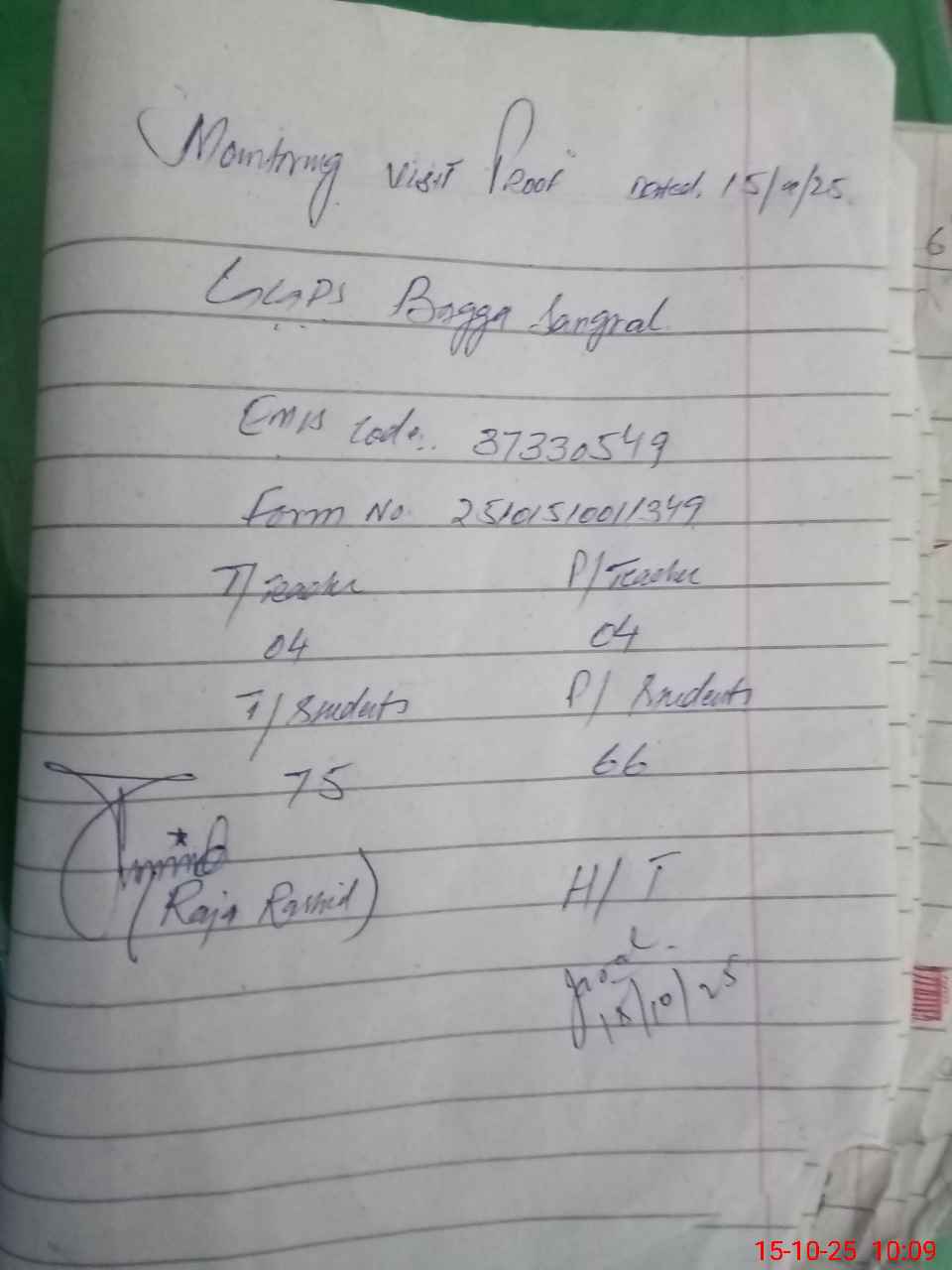 | Monitoring Date: 15-10-2025 | Start Time: 15-10-2025 09:35 AM | End Time: 15-10-2025 10:10 AM | Name of MEA: Ra**** Ra**** Al**** | |