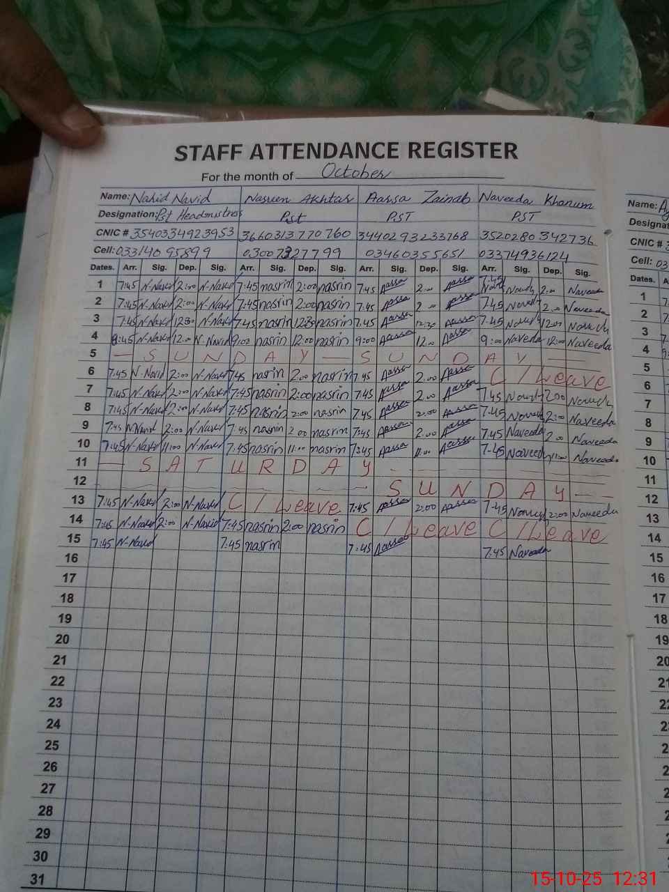 | CNIC | Full Name | Designation | R/C | Absence During Last Calender Month |
