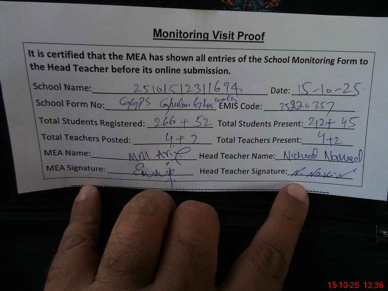 | Attendance Register | Head Teacher | MEA with School | Visit Proof |