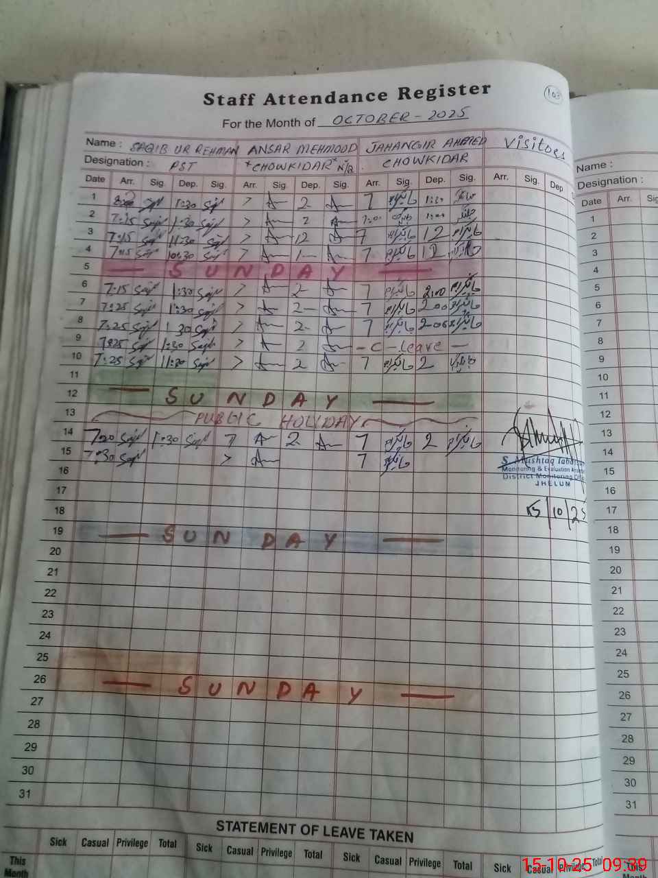 | CNIC | Full Name | Designation | R/C | Absence During Last Calender Month |