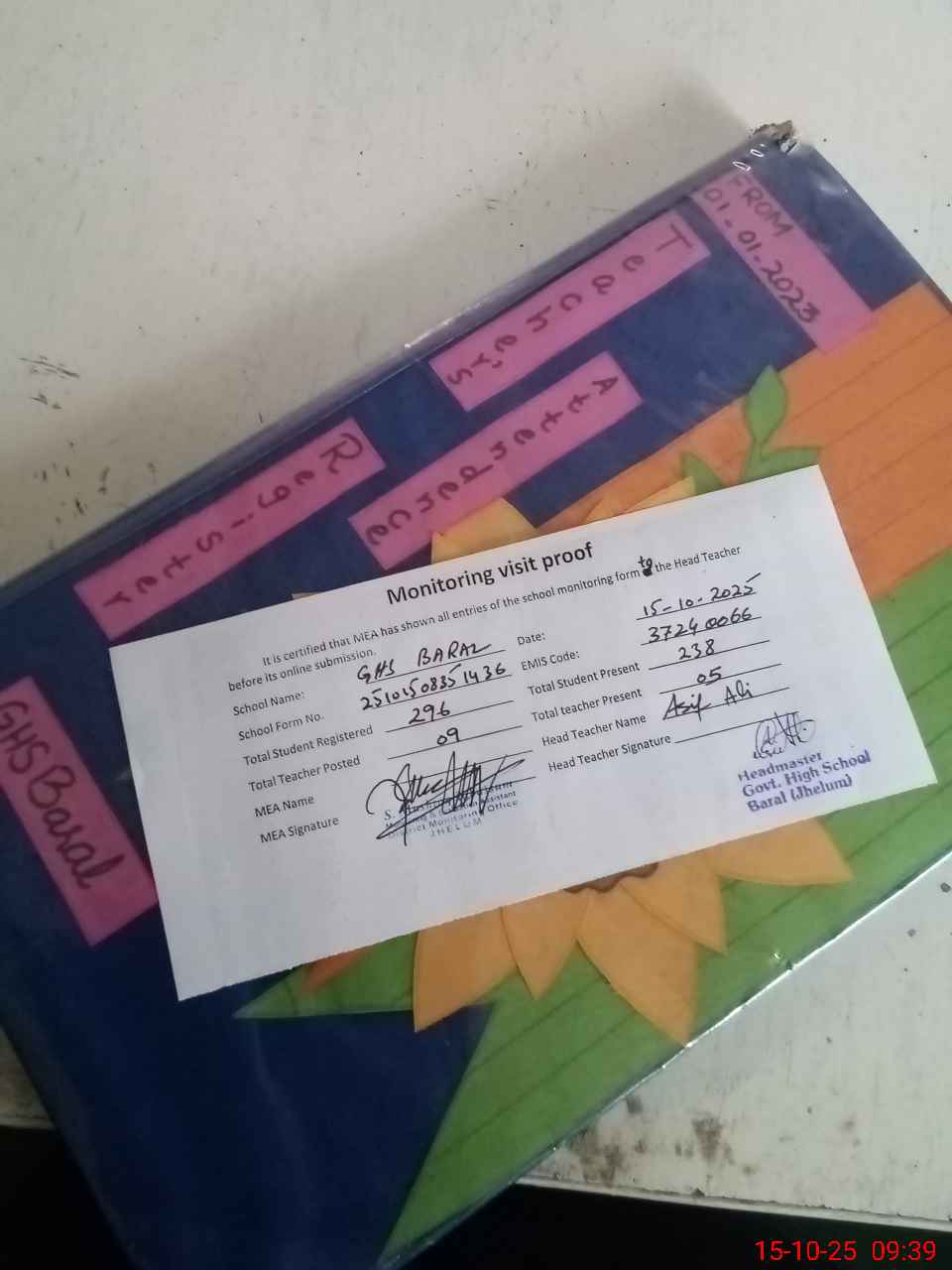 | Attendance Register | Head Teacher | MEA with School | Visit Proof |