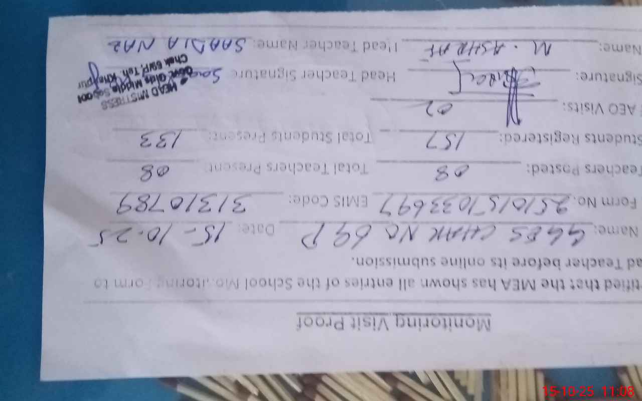 | Attendance Register | Head Teacher | MEA with School | Visit Proof |